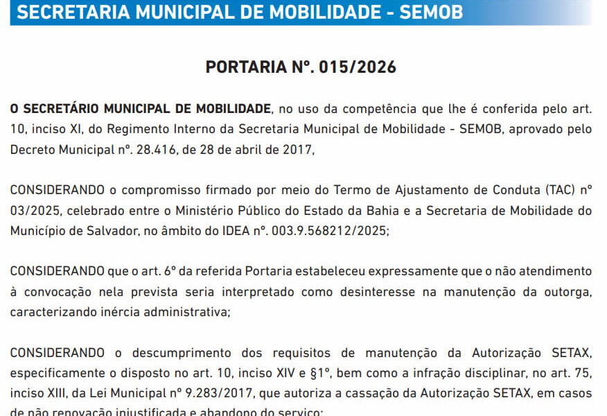 A Secretaria Municipal de Mobilidade (Semob) oficializou, nesta quinta-feira (15), por meio da Portaria nº 015/2026, o cancelamento definitivo de 348 autorizações do Sistema de […]